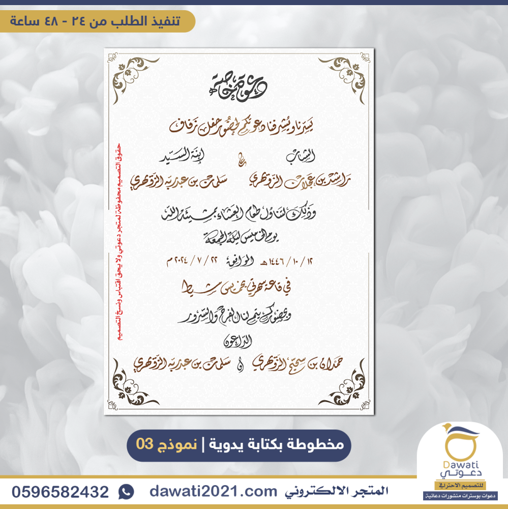 - السعر ثابت وغير قابل للتفاوض ( مع العلم يتوفر بالمتجر دعوات عادية بدون مخطوطة من 50 ريال)